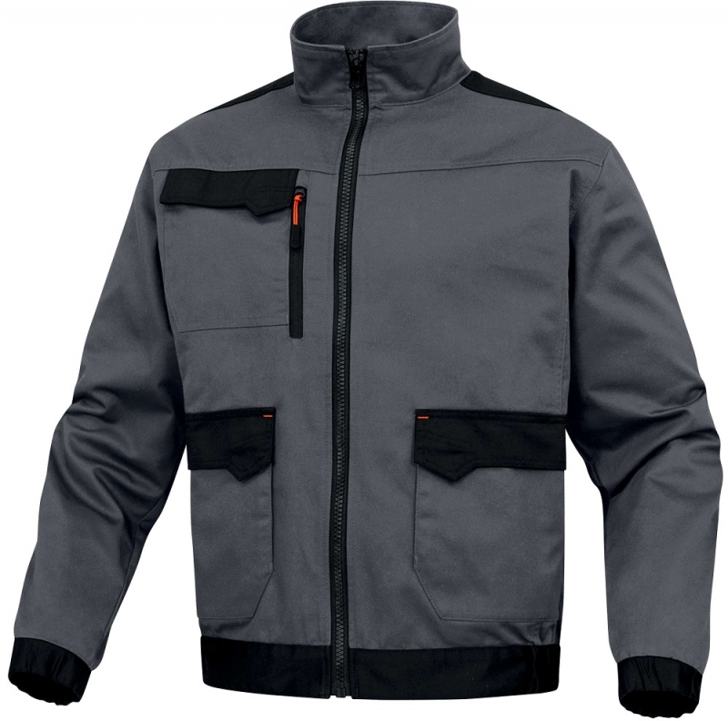 Straight silhouette working jacket with a front zipper. Stand collar. 7 pockets 3 of which are protected by flaps with Velcro. Chest zipped pocket with a removable badge holder. Elasticated waist and cuffs. Color: grey + black. Sizes: S / M / L / XL / XXL / XXXL