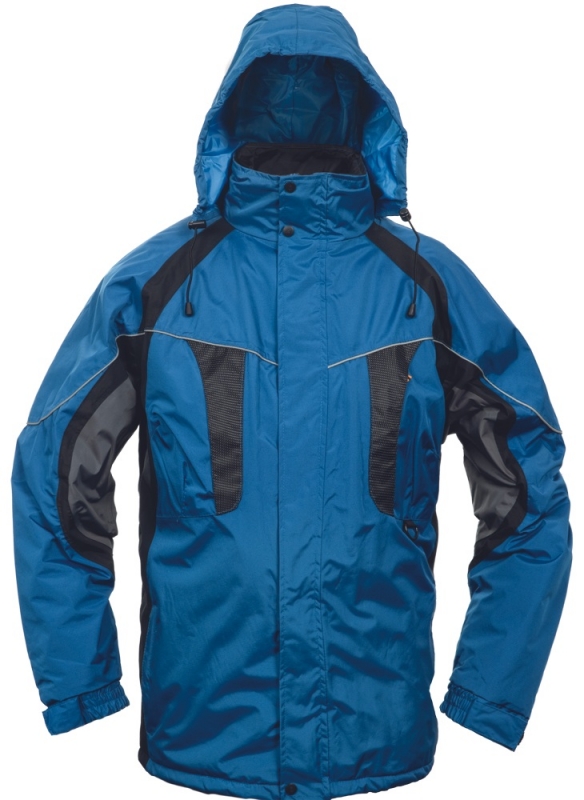 Nyala winter parka, blue. Insulated work coat. Outer material: PVC coated polyester for rain protection. Fastened with a zip under a storm flap. Adjustable elasticated waist. Adjustable sleeves hem by Velcro. 190 g/m2polyester lining. The hood can be integrated in the collar. Two side pockets and two chest zipper pockets. Color: navy blue. Size: S / M / L / XL / XXL / XXXL