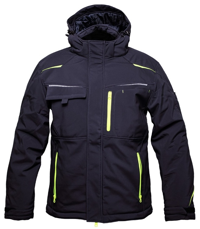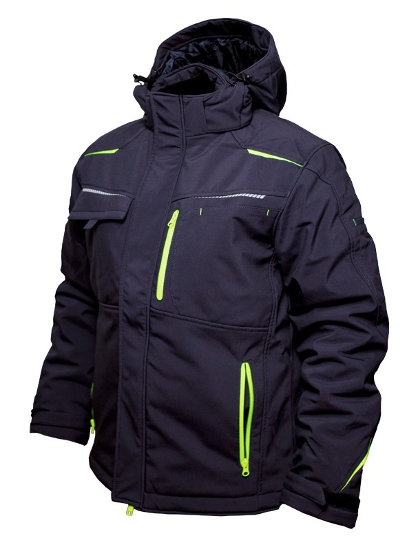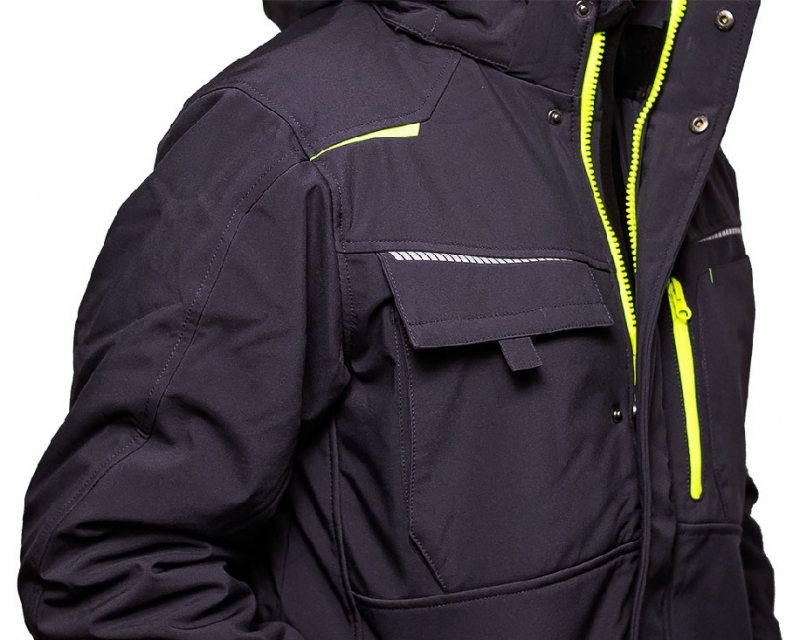 Westport winter parka. High comfort insulated work coat. Outer material: polyester Softshell 320 g/m2. Fastened with a zip under a storm flap. Adjustable elasticated waist with stoppers. Adjustable sleeves hem by Velcro. Polyester lining with additional silver heat reflective material for warmth saving. The hood can be detached. Multiple functional pockets. Color: dark grey. Size: S / M / L / XL / XXL / XXXL