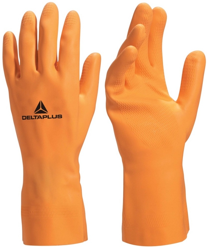 Перчатки латексные VE450. Рабочие химически стойкие перчатки из латекса. Хлопковое волокно внутри перчаток для повышения уровня комфорта в использовании. Текстурированная поверхность в области ладони и пальцев предотвращает скольжение удерживаемых предметов. Длина: 30 см / Толщина: 1,0 мм. Цвет: оранжевый. Размер: 8/9 / 9/10 / 10/11