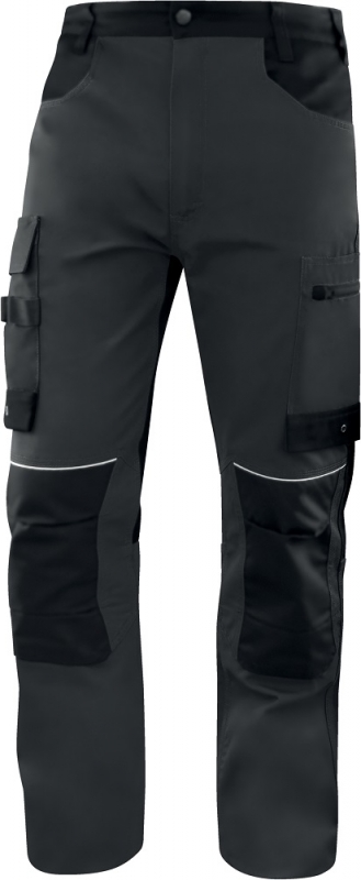 Эластичные вставки в поясе. Формованные колени. 11 карманов, в том числе для телефона и инструментов. Карманы для наколенников. Декоративные светоотражающие элементы. Фиксированный держатель для бейджа. Тройные швы и дополнительное усиление в паховой зоне. Цвет: темно-серый + черный. Размер: S / M / L / XL / XXL / XXXL / 4XL