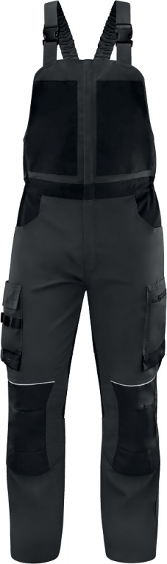 Регулируемые по длине лямки с эластичными вставками. Двухходовая центральная застежка-молния под защитной планкой. Эластичные вставки в поясе. Формованные колени. 10 карманов, в том числе для инструментов. Карманы для наколенников. Декоративные светоотражающие элементы. Фиксированный держатель для бейджа. Тройные швы и дополнительное усиление в паховой зоне. Цвет: темно-серый + черный. Размер: S / M / L / XL / XXL / XXXL