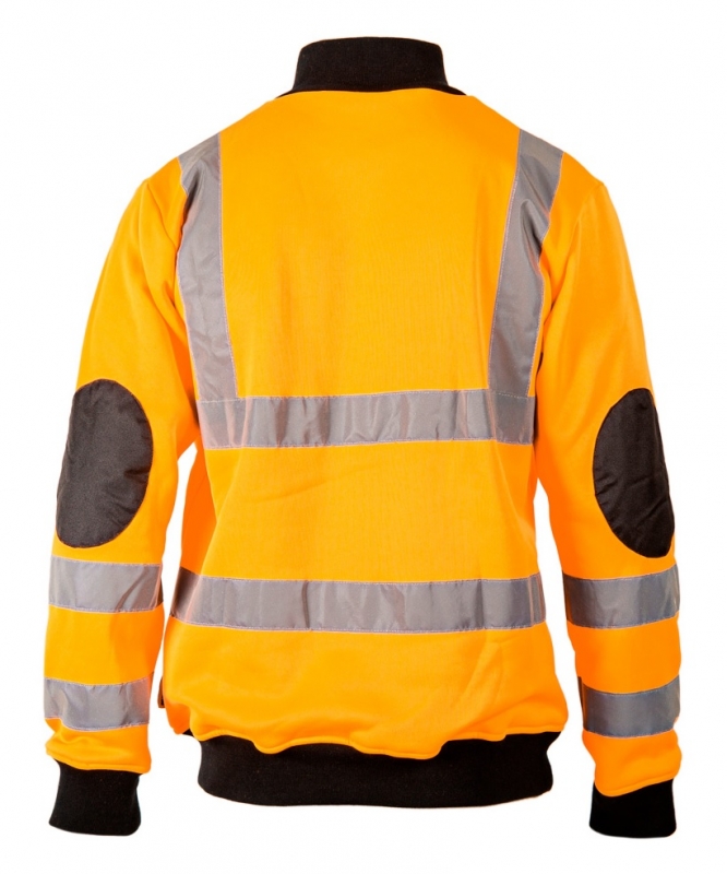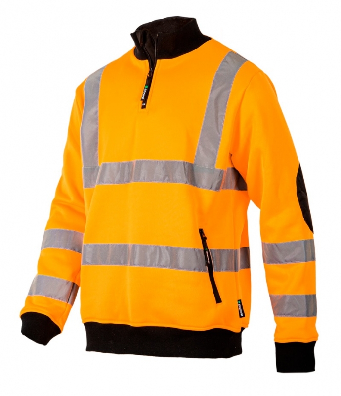 Сигнальный свитер BRIGHTON. Свитер повышенной видимости для работы на строительстве и вблизи движущегося транспорта. Хорошо заметный стандартизированный оранжево-красный цвет. Ткань джерси из 100% полиэстера плотностью 280 г/м2. Прямой воротник с застежкой и дополнительной защитной планкой. Локти усилены вставками из прочной ткани Оксфорд. Эластичные вставки воротника, манжетов и низа свитера. Два кармана перекрываемых застежками-молниями. Световозвращающие полоски для повышения безопасности пользователя в ночное время. Цвет: флуоресцентный оранжевый. Размер: S / M / L / XL / XXL / 3XL